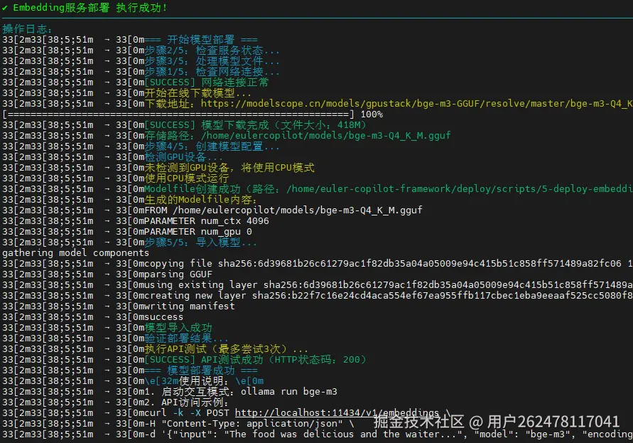 成功部署了 bge-m3 文本嵌入模型(GGUF格式,418MB),从 ModelScope 下载模型文件到本地路径,配置为 CPU 模式运行(未检测到 GPU),设置了上下文长度 4096,并通过 API 测试验证部署成功(HTTP 200),最终可通过 ollama run bge-m3 交互使用或通过 localhost:11434 的 REST API 调用。