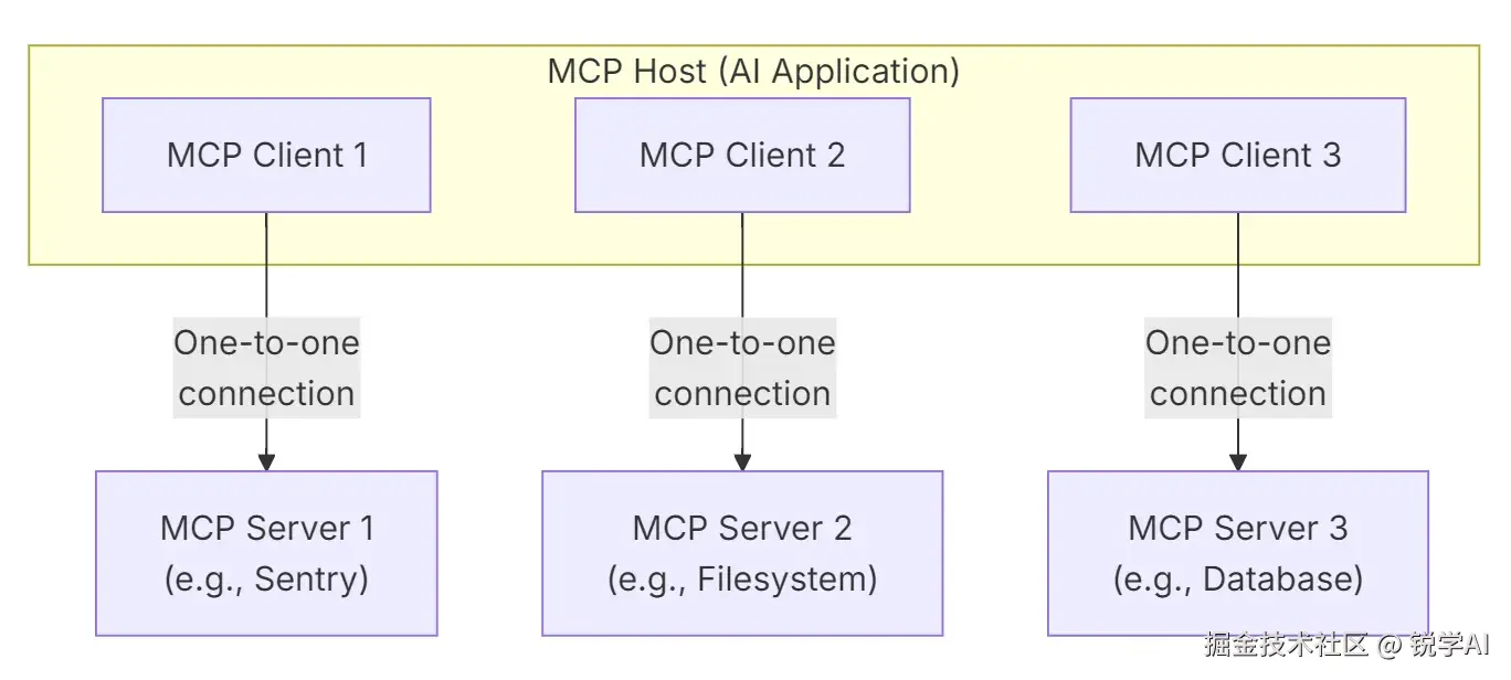 MCP遵循客户端-服务器架构,其中MCP主机(如Claude Code或Claude Desktop等AI应用)与一个或多个MCP服务器建立连接。MCP主机通过为每个MCP服务器创建一个MCP客户端来实现这一点。每个MCP客户端与其相应的MCP服务器保持一对一的专用连接。