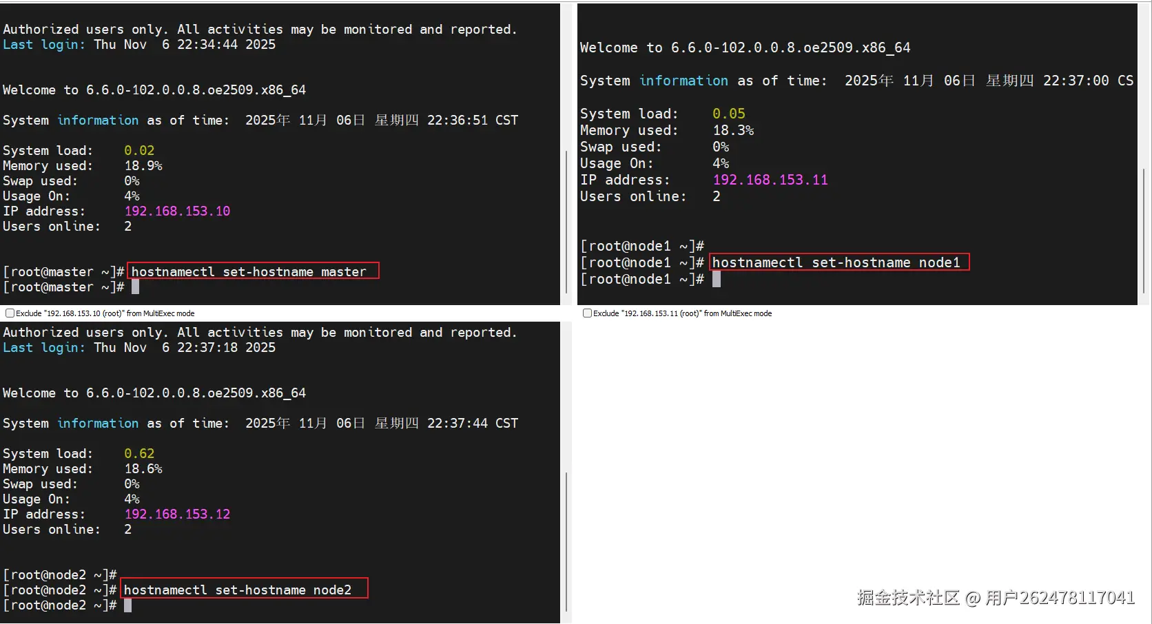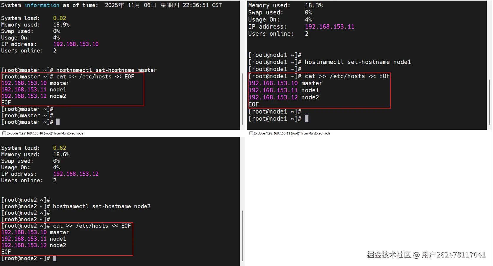 hostnamectl set-hostname master # 各节点按实际修改(master,node1,node2)