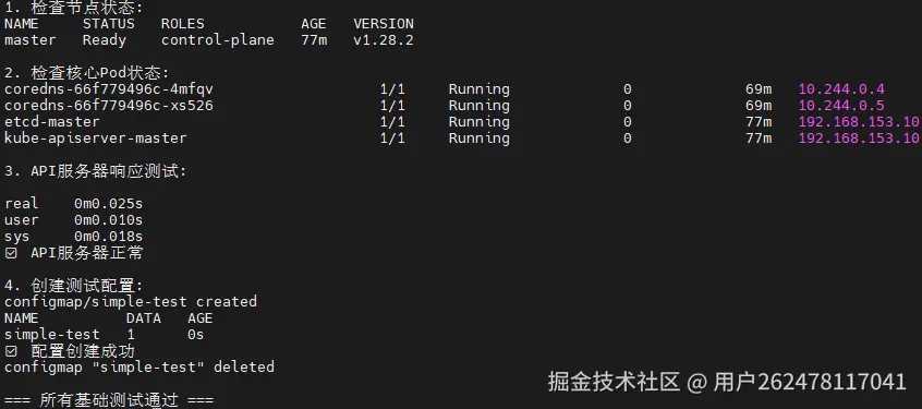 集群连通性:通过检查节点状态、核心组件 Pod、API 服务器响应及简单配置创建,验证集群基本功能正常。