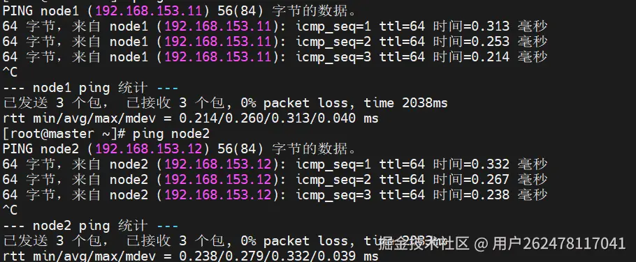hosts文件配置完成后,在master节点ping node1和node2节点,测试成功