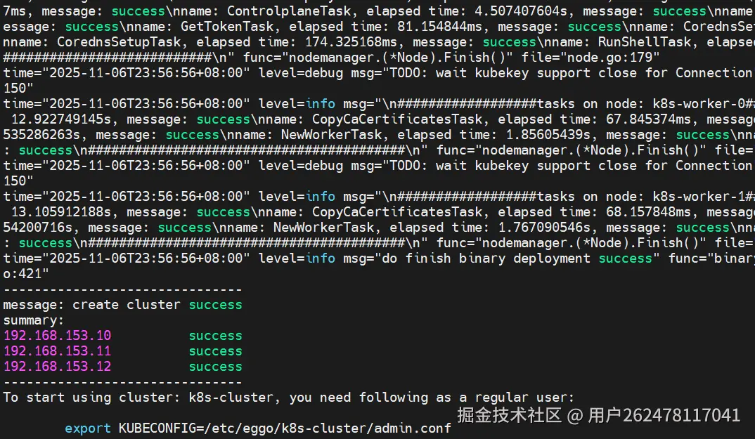 Eggo 自动化部署:通过安装 Go 环境、克隆 eggo 源码并编译,结合配置文件快速完成集群搭建。配置中指定了集群 ID、网络参数(如 podCIDR 10.244.0.0/16、serviceCIDR 10.96.0.0/16)以及 Calico 网络插件,部署后通过