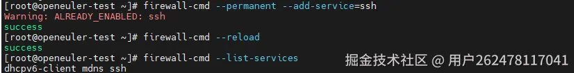 Warning:ALREADY_ENABLED:ssh这个警告是告诉我们SSH服务已经存在于防火墙的永久规则中了。不影响后续咱们操作。