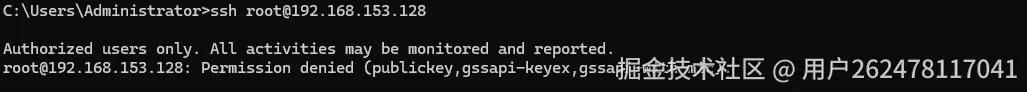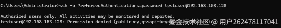 这里我们尝试使用密码登录,系统返回权限被拒绝(只允许公钥,gssapi-keyex,gssapi-with-mic等认证方式)