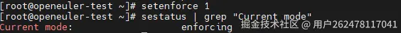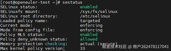 SELinux(Security-Enhanced Linux)是 openEuler 的核心安全模块,默认启用,用于强制访问控制(MAC),防止进程越权访问资源。openEuler 22.03 LTS 默认模式为 enforcing,确保系统安全。
