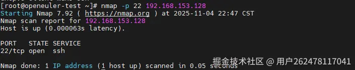 从结果可以看出,已经成功扫描了 IP 地址为 192.168.153.128的计算机,发现它正在运行 SSH 服务,并且该服务可以通过网络的 22号端口进行访问。