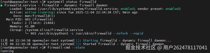 安全分析:firewalld 默认启用并运行,openEuler 的集成确保了开箱即用的网络防护。相比 UFW 或 iptables,firewalld 的 zone 概念更适合多接口环境,在 NAT 模式下有效隔离外部访问,突出 openEuler 的企业级安全设计。