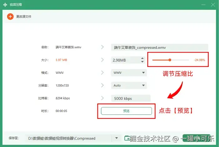 步骤三:使用鼠标调节压缩比,压缩比的大小没有具体的标准,您可以随便调节。点击 【预览】 按钮,预览当前的压缩效果,可以更好地设置压缩比。