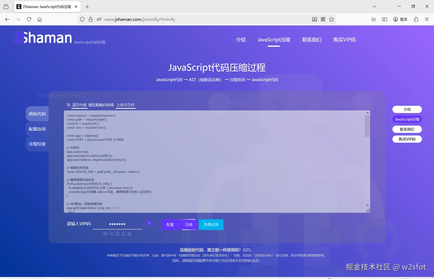 JS代码压缩有效果吗? w2sfot 2025-12-09 27 阅读1分钟 压缩一份JS代码,看看压缩率怎么样。 JS代码: 代码大小: 用JShaman的JS代码压缩: 压缩配置: 压缩: 压缩完成: 使用起来还跟压缩前一样。