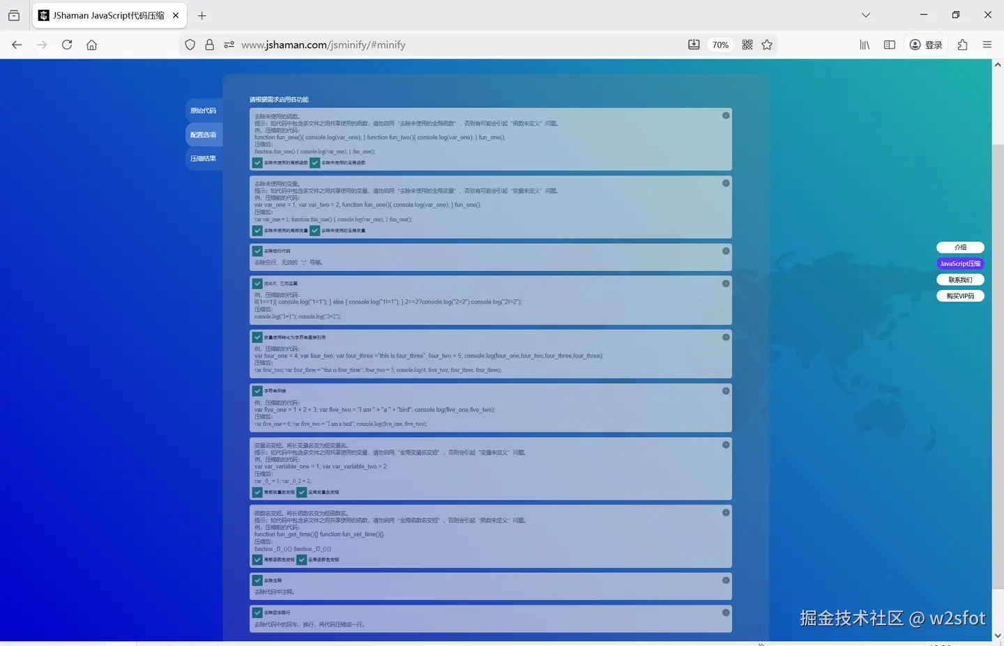 JS代码压缩有效果吗? w2sfot 2025-12-09 23 阅读1分钟 压缩一份JS代码,看看压缩率怎么样。 JS代码: 代码大小: 用JShaman的JS代码压缩: 压缩配置: 压缩: 压缩完成: 使用起来还跟压缩前一样。