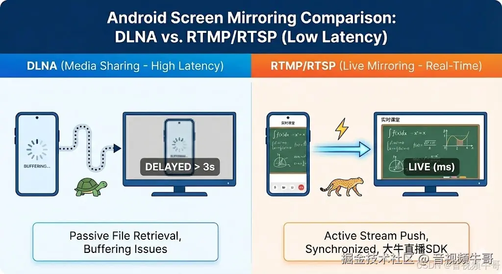 这就是 RTMP/RTSP 在同屏领域长期碾压 DLNA 的根本原因,也是越来越多开发者选择大牛直播SDK的核心动力。