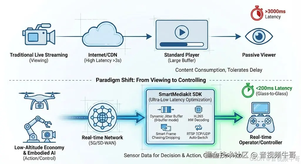 摘要: 随着2024年“低空经济”首次写入政府工作报告,以及“具身智能”成为AI领域的下一个高地,实时视频传输技术正面临前所未有的挑战。无人机的高速巡检、机器人的远程遥操作(Teleoperation),都对视频流的延迟提出了毫秒级的苛刻要求。本文将结合行业趋势,深度剖析基于大牛直播SDK(SmartMediakit)的超低延迟RTMP/RTSP播放器技术,探讨如何在弱网环境下实现“所见即所得”的极致视觉反馈。