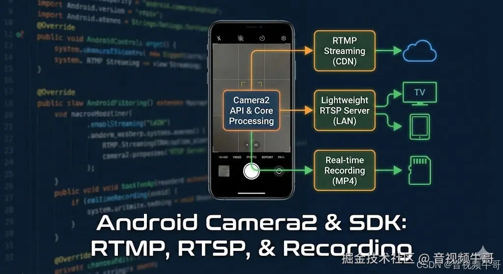 在移动端音视频领域,单纯的 RTMP 推流已不再是技术天花板。真正的挑战在于:如何在资源受限的 Android 设备上,构建一个既能“对外”进行 RTMP 直播、又能“对内”提供低延迟 RTSP 分发,同时还能完成“本地”高保真录像的『全功能媒体节点』?