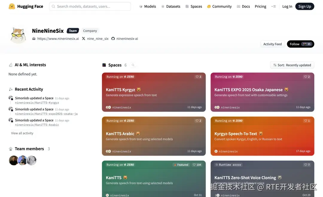 吉尔吉斯斯坦 AI 初创公司 NineNineSix 发布了开源的文本转语音(TTS)模型 KaniTTS。该模型在消费级 GPU 上实现了接近实时的语音生成,性能可与 ElevenLabs、OpenAI 等商业模型媲美,并采用 Apache 2.0 许可证完全免费提供。