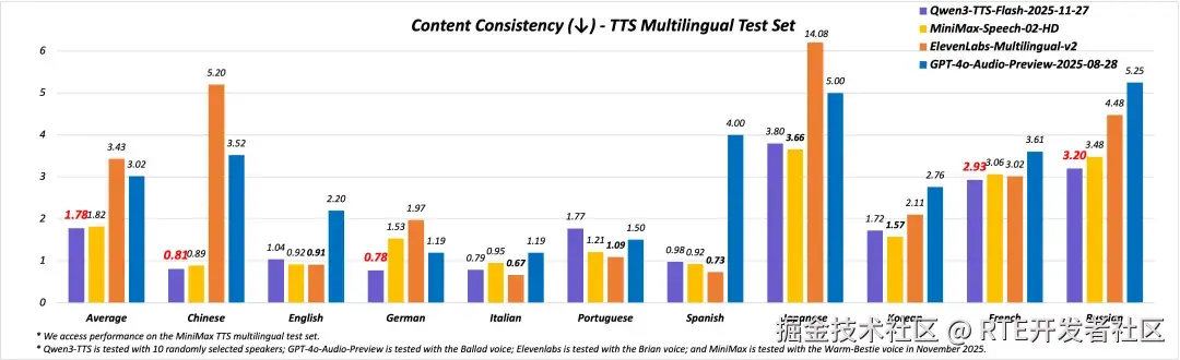 多语种多方言能力持续增强:Qwen3-TTS 支持中文、英文、德语、意大利语、葡萄牙语、西班牙语、日语、韩语、法语、俄语等 10 大主流语言,在 MiniMax TTS multilingual test set 上,平均词错误率(WER)优于 MiniMax、ElevenLabs 及 GPT-4o-Audio-Preview。支持更多音色的方言生成,包括普通话、闽南语、吴语、粤语、四川话、北京话、南京话、天津话和陕西话,真实还原地方口音特色与语言神韵。