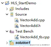 其中,VectorAdd.h 为头文件;VectorAdd.cpp为源文件;VectorAdd_tb.cpp为Test Bench。该工程代码主要实现的功能是:在一个for循环内,对一个数组做加法。顶层函数如下: