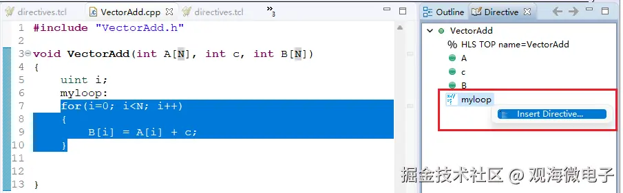 (2)给命名为“myloop”的循环添加directive指令。右键“myloop”,点击“Insert Directive…”