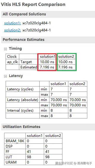 (5)由于在Vitis HLS 2021.1版本中,建立新工程(solution1)时即便没有添加directives,HLS会给solution默认添加“HLS PIPELINE”指令。而我们给solution2添加的directives也为“HLS PIPELINE”指令,因此两个Solutions综合编译出来的结果是一致的(大家可以尝试添加不同的directives指令,然后对比下不同Solutions综合编译出的结果)。