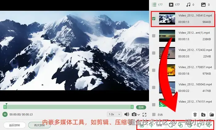 第3步:录制结束后点击停止按钮,软件会自动保存原始文件并跳转至预览界面。如果还需要优化视频,可以直接进入内置编辑模块,完成片段分割、文件重命名、特效添加等后期操作。