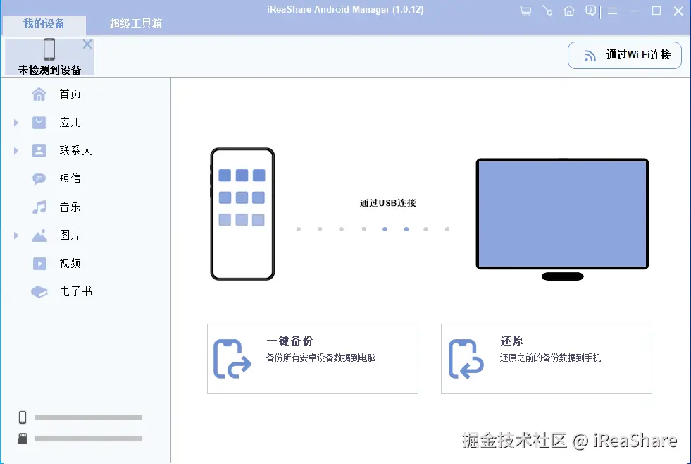 打开 iReaShare 软件,它应该会自动检测到您的安卓设备。在安卓设备上启用 USB 调试模式,程序就能立即识别您的设备。