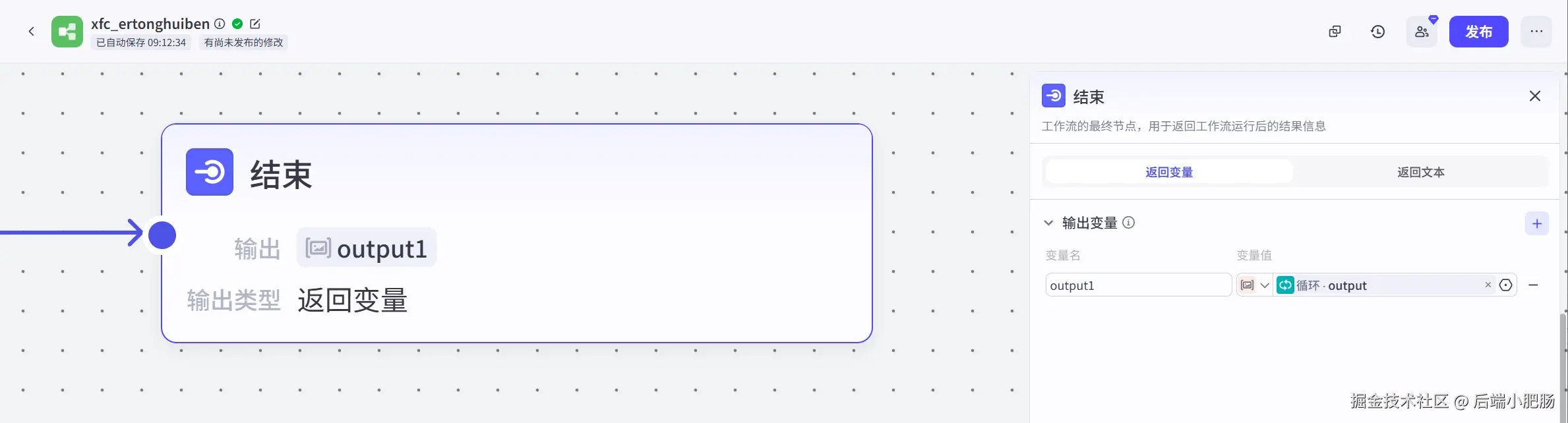结束: 结束节点参数为output,对接到循环节点输出的卡通绘本图片列表。