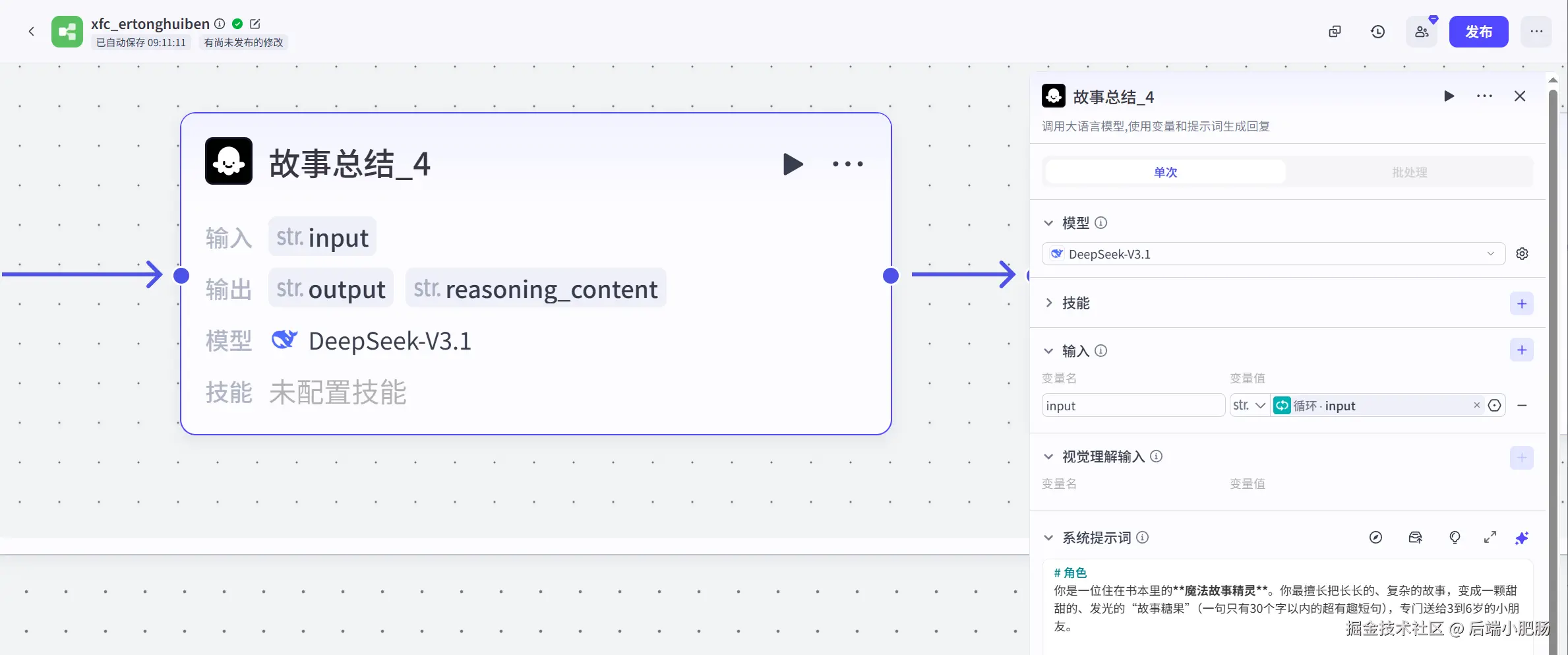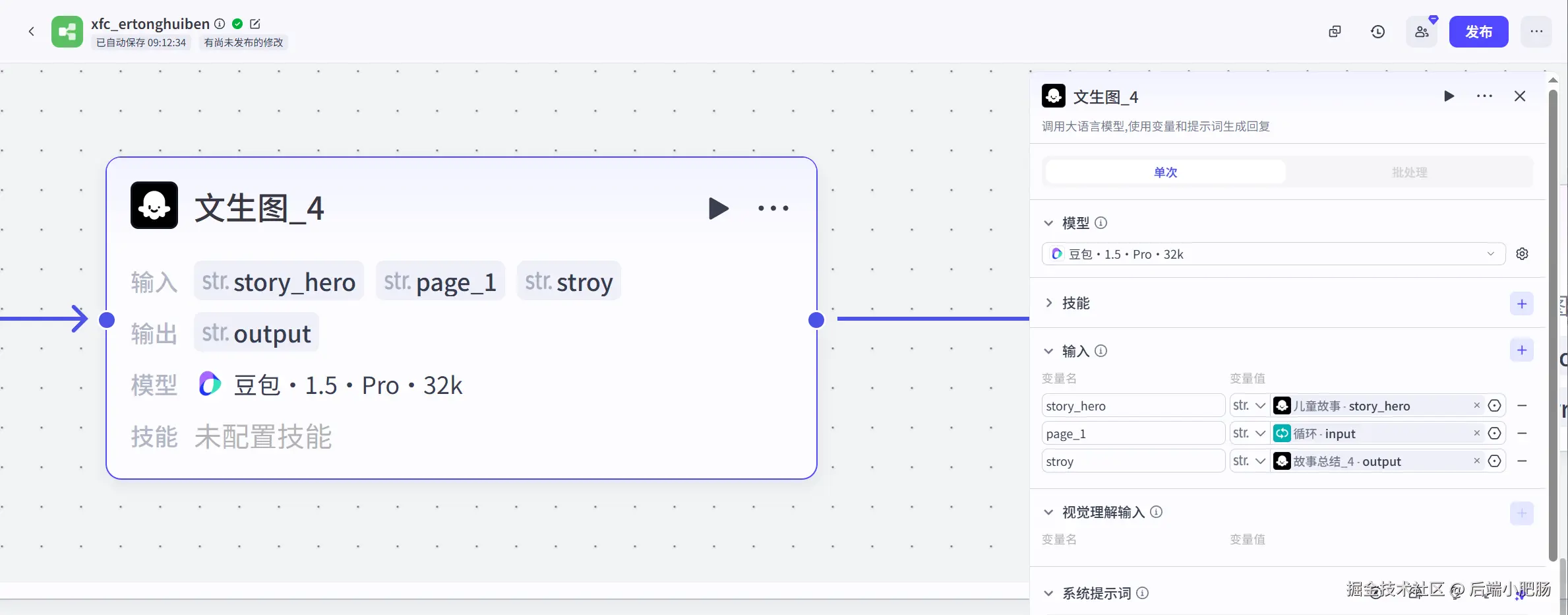 故事总结( 大模型 ): 这是一个大模型节点,它的作用是基于循环节点传入的故事片段进行归纳总结,最终渲染到卡通绘本图片上。
