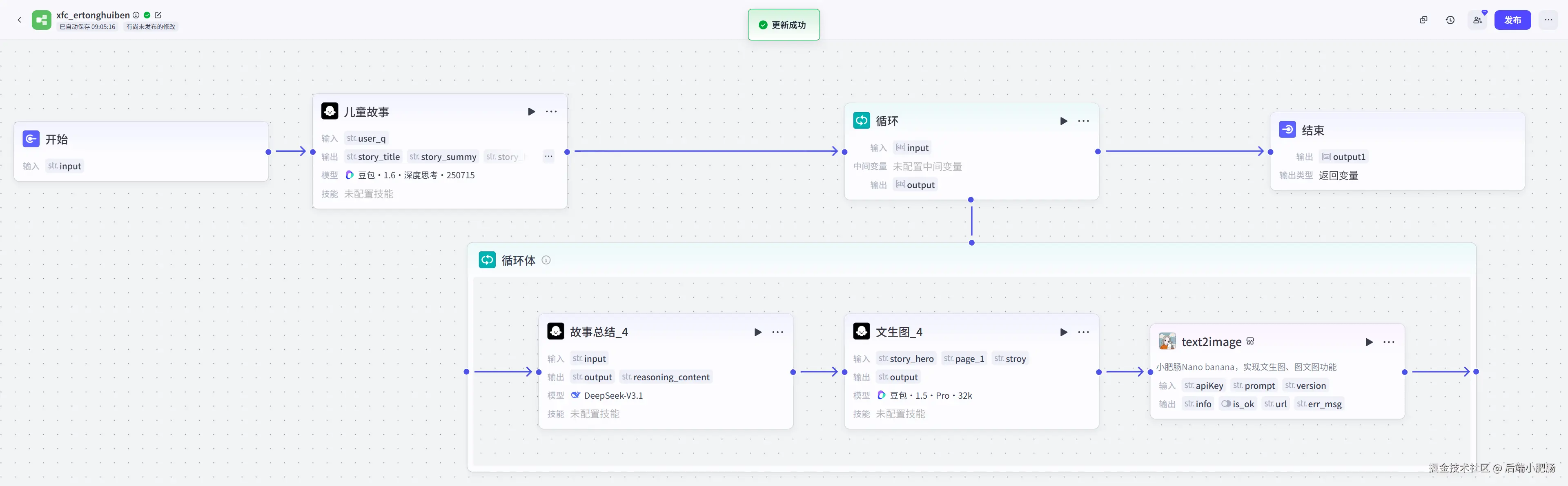 至此,一套完整的儿童绘本自动化工作流就搭建完成了。回顾一下,我们利用 Coze 强大的逻辑编排能力,结合 Nano Banana Pro 插件的高质量生图能力,成功解决了过去绘本制作中角色不一致和画风难统一的两大痛点。