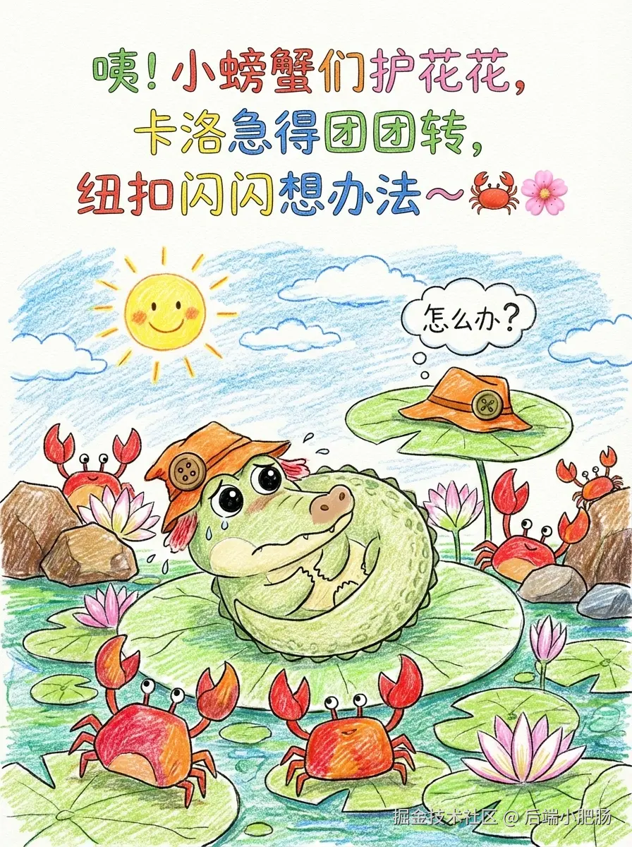 基于故事情节和主角形象生成儿童彩色铅笔涂鸦风格 (Child-like Colored Pencil Drawing Style)风格的图片,并将故事梗概放置到图片上方