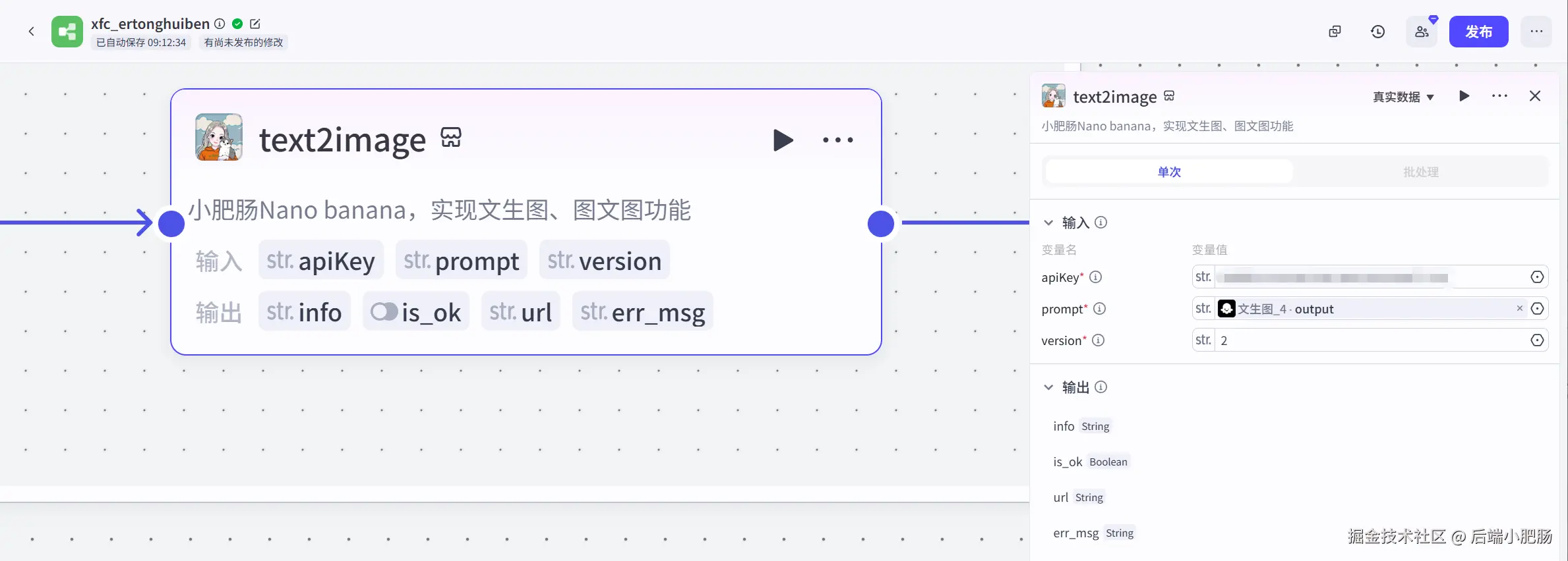 text2image(Nano Banana Pro生图节点): 这个我团队开发的Nano Banana Pro生图插件,输入apiKey,propmt选到文生图( 大模型 ) 节点的输出参数,version填2。