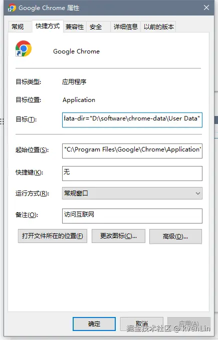 右键chrome点击属性-快捷方式, 配置桌面图标快捷启动的命令