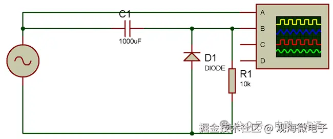 首先将变压器的 12V(交流电源)引脚连接到电容器,然后将二极管的正极端子连接到电容器的另一个端子,将负极端子连接到变压器的 0V 引脚。现在将一个 10K 电阻器并联到二极管。如图所示,将示波器的通道A连接到输入侧,将通道B连接到输出侧。现在你已经准备好了。打开变压器和示波器并将两个通道调整为 0V 线路,您会看到通道 B 向下移动,如下图所示。通道 A 为黄色,通道 B 为蓝色。