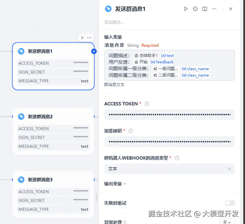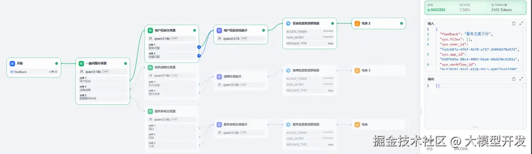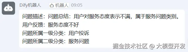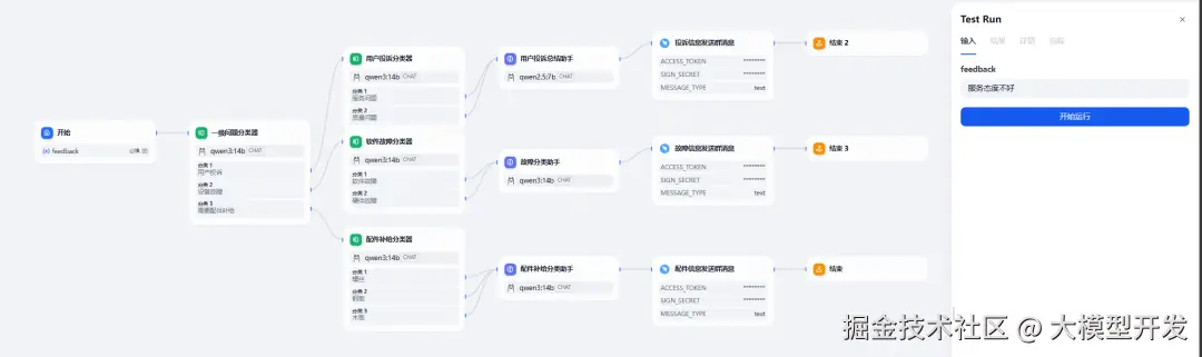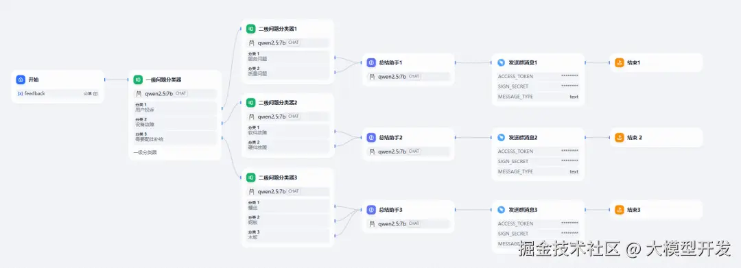 我们这里构建一个使用了钉钉群机器人的消息反馈工作流。将用户的文字问题进行分类和拆解分析后通过钉钉群机器人发送到群中。【企业微信 webhook 同理】