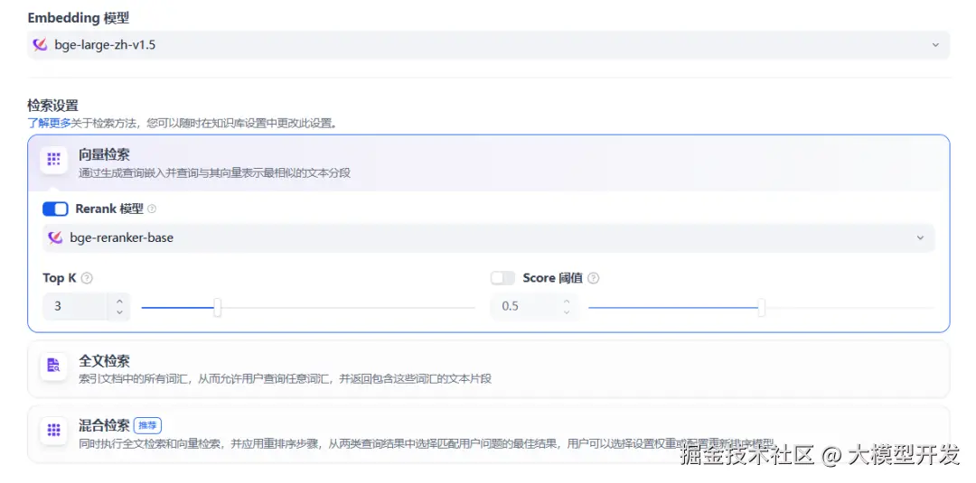 在这里可以选择Embedding模型和Rerank模型,也可以设置Top K,也就是选出最相似的前n条。选择Score阈值,即筛选文本的相似度阈值。