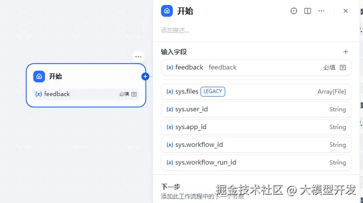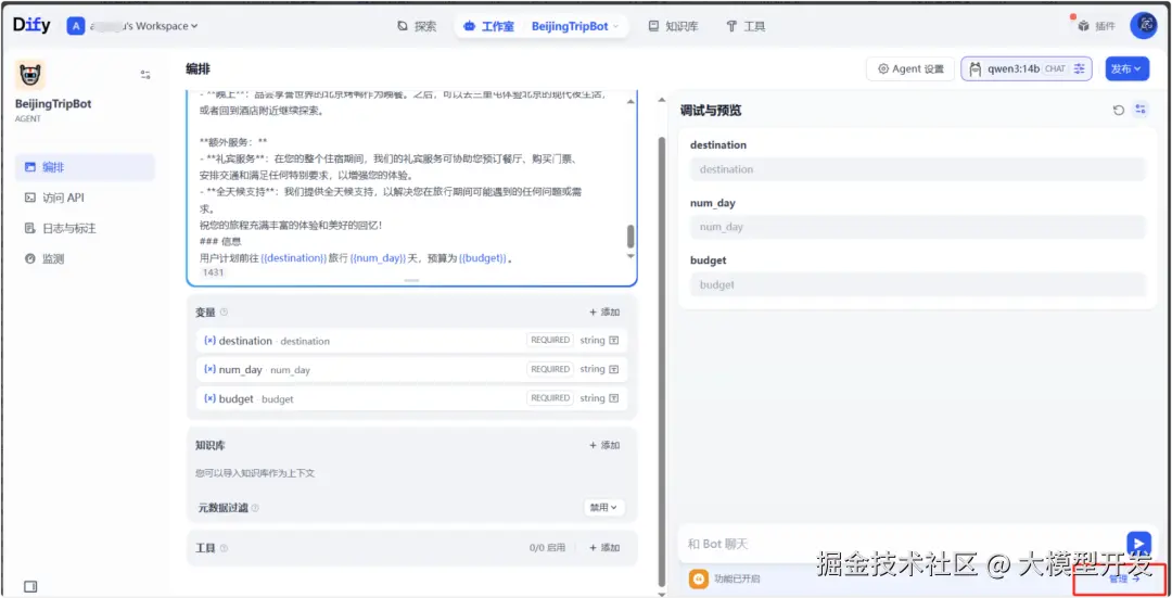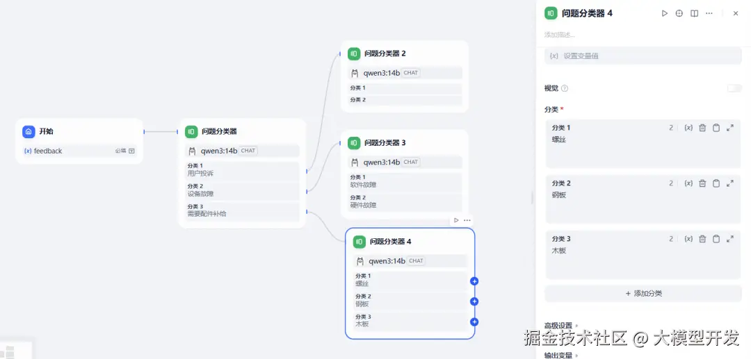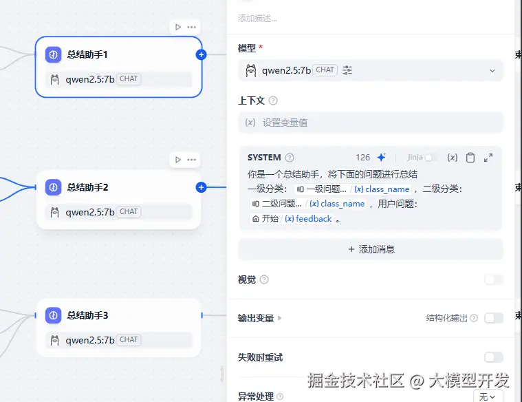 是问题分类器的下游,在系统提示词中传递进两级分类的名称,以及初始问题,要求进行总结(需要输入变量的时候只需要输入一个 / 即可开始联想寻找)