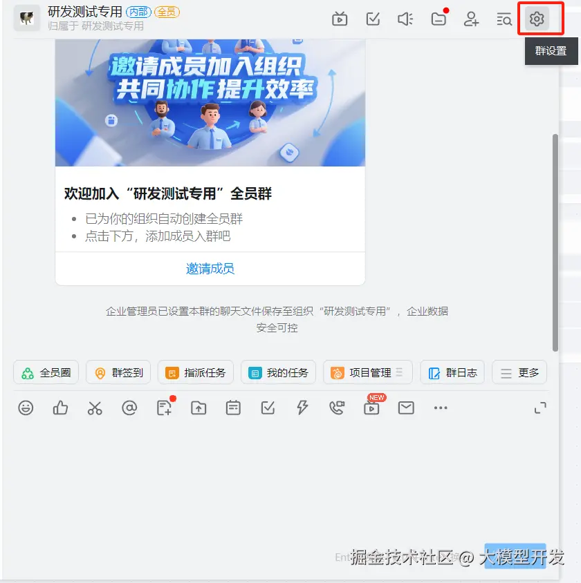 我们要使用PC端的钉钉进行群机器人的创建。首先你需要在一个你是管理员的组织内创建一个群,然后才能在这个群里创建机器人