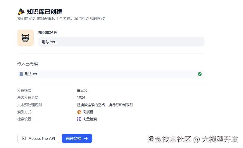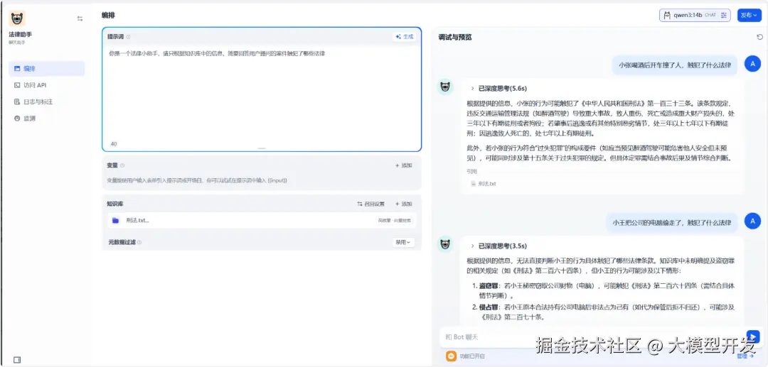 知识库选择刚才添加的刑法.txt,然后可以开始提问。