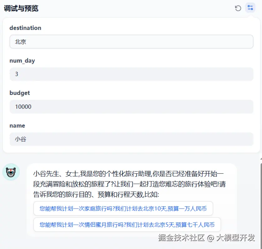 在本节我们将实现⼀个旅游规划助理的 agent 应用,它可以根据用户输入的旅行目的地、旅行天数、预算等信息输出结构化的旅行计划。