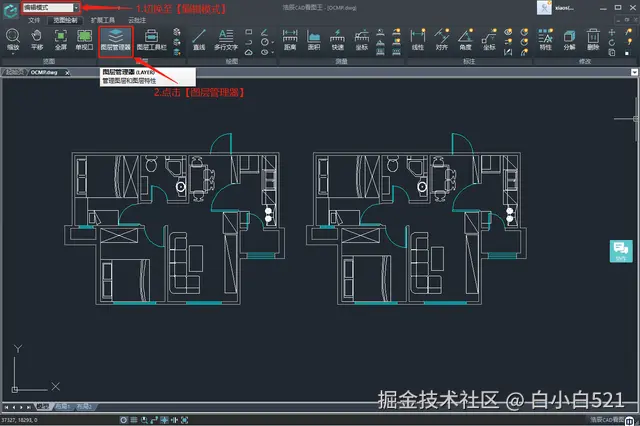 在浩辰CAD看图王电脑版中打开需要修改的图纸文件,然后将其切换至【编辑模式】,依次点击【览图绘制】—【图层管理器】。