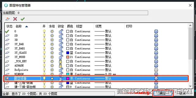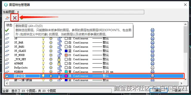 在跳出的【图层特性管理器】对话框中,找到并选中需要删除的CAD图层(如下图中的“厨卫设备”图层),点击列表上方的红色【X】按钮。