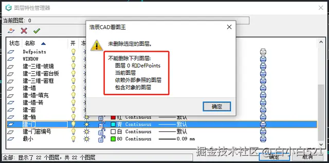当然也不是所有的CAD图层都可以随意删除,如果选中不可删除的图层点击【删除】按钮会跳出提示框,提示:未删除选定的图层。