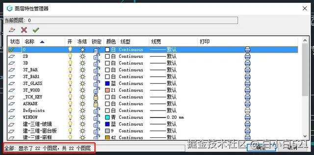 再次打开【图层特性管理器】可以看到当前图纸中共22个图层。