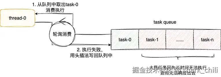 活锁是另一种形式的活跃性问题,该问题尽管不会阻塞线程,但可能也会出现线程不能继续执行后续工作,例如当前线程将处理失败的任务每次失败都提交到队列首部,不断重试执行这个失败任务,造成后面的任务无法执行,这就是典型的线程饥饿。