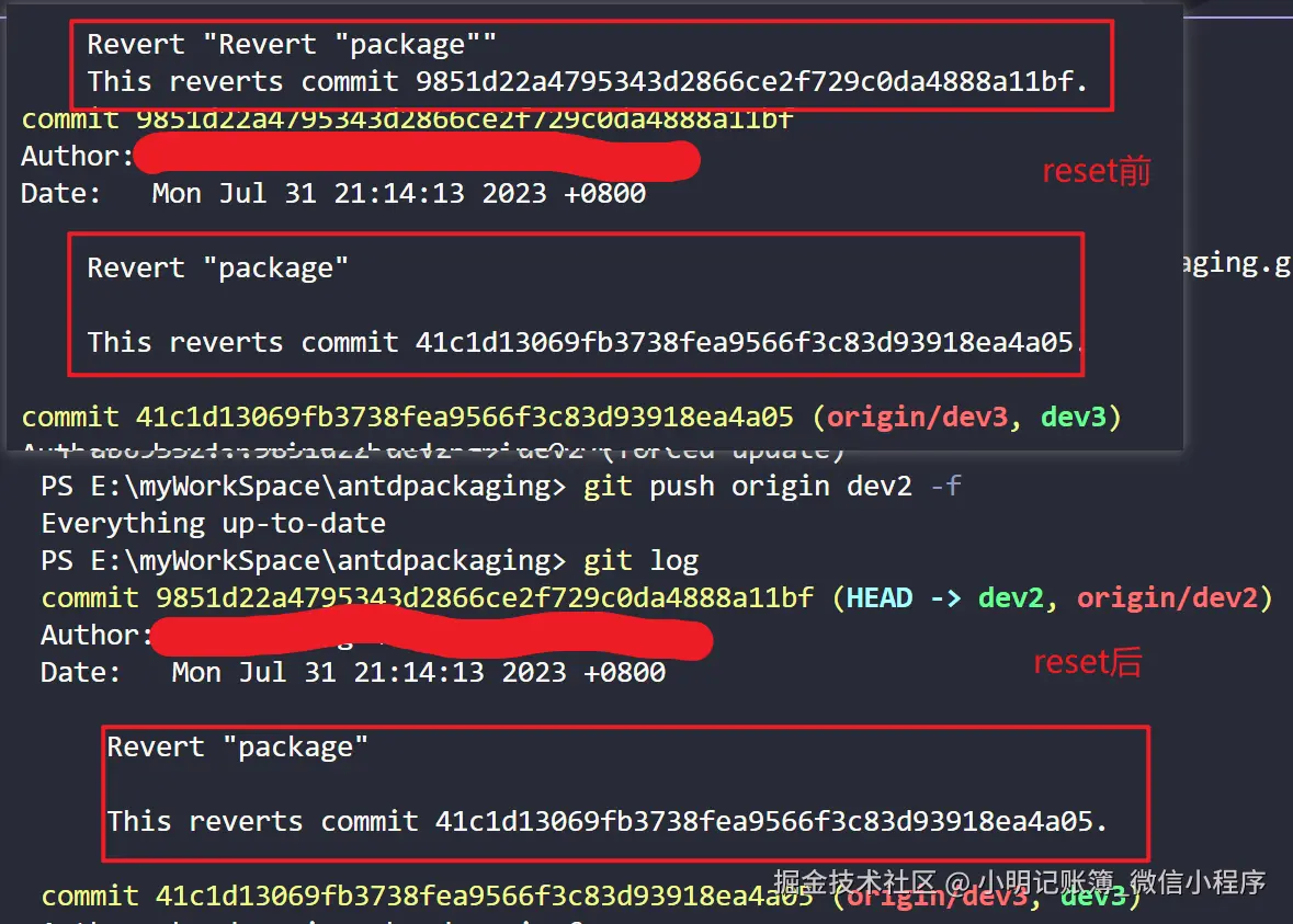 git reset 后要执行git push origin branch_name -f,前后log对比,commit中不在存在记录。