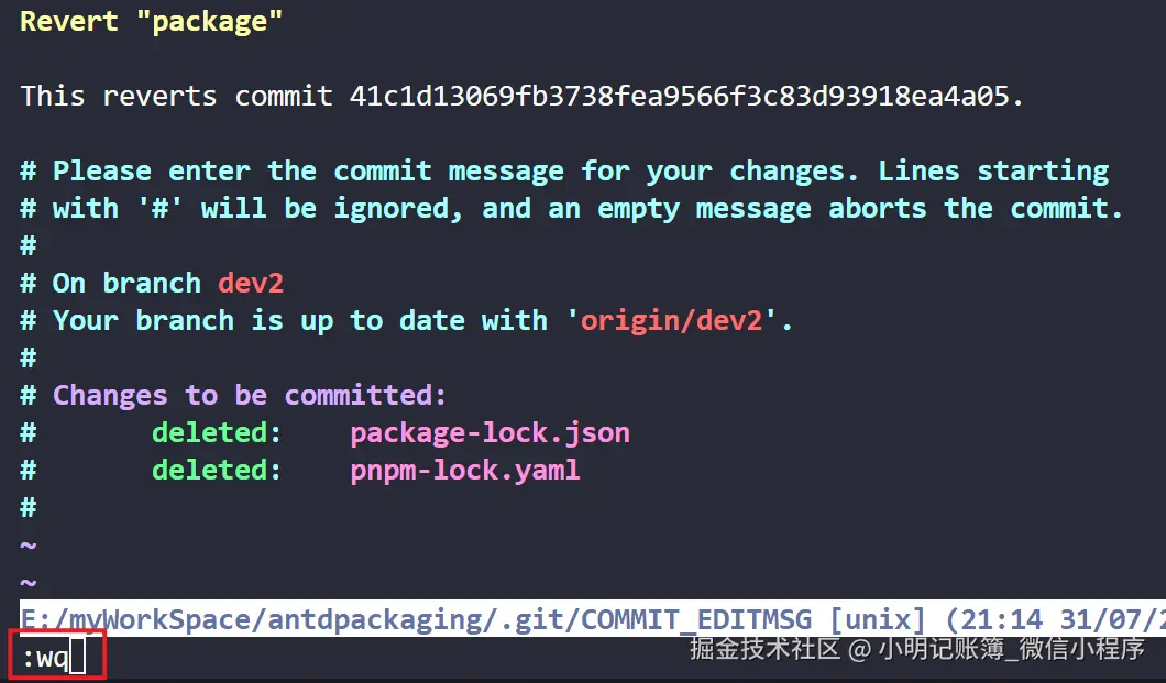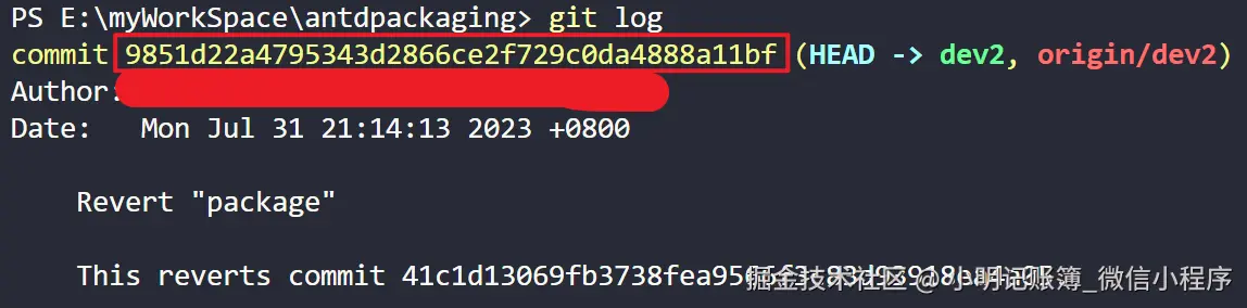 使用git revert 之后如果想再次merge 会无法merge过来,这个时候只需要找到上次revert的commit_id ,再次执行 git revert 9851d22a4795343d2866ce2f729c0da4888a11bf,然后再按上面的步骤执行:wq、git push就可以了。