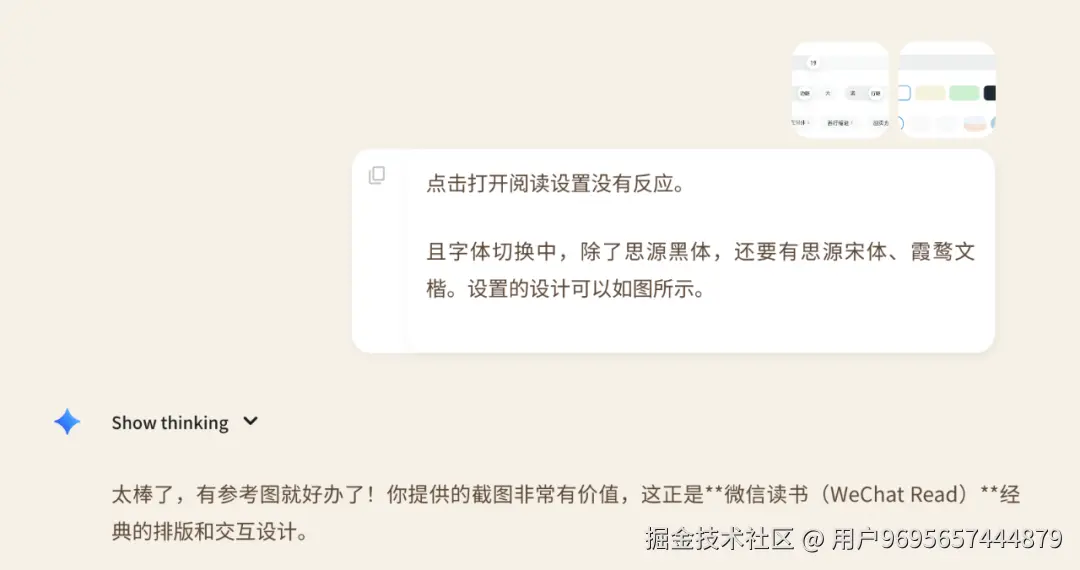 接着,我指出了悬浮按钮点了没反应的问题,又截图了微信读书的设置界面供它参考,并且要求增加新的字体。