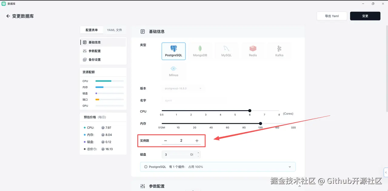 - 部署数据库 我直接从 Sealos 的“应用商店”里,一键启动了一个高可用的 PostgreSQL 集群。备份、监控这些繁琐的工作,平台都已自动处理好。