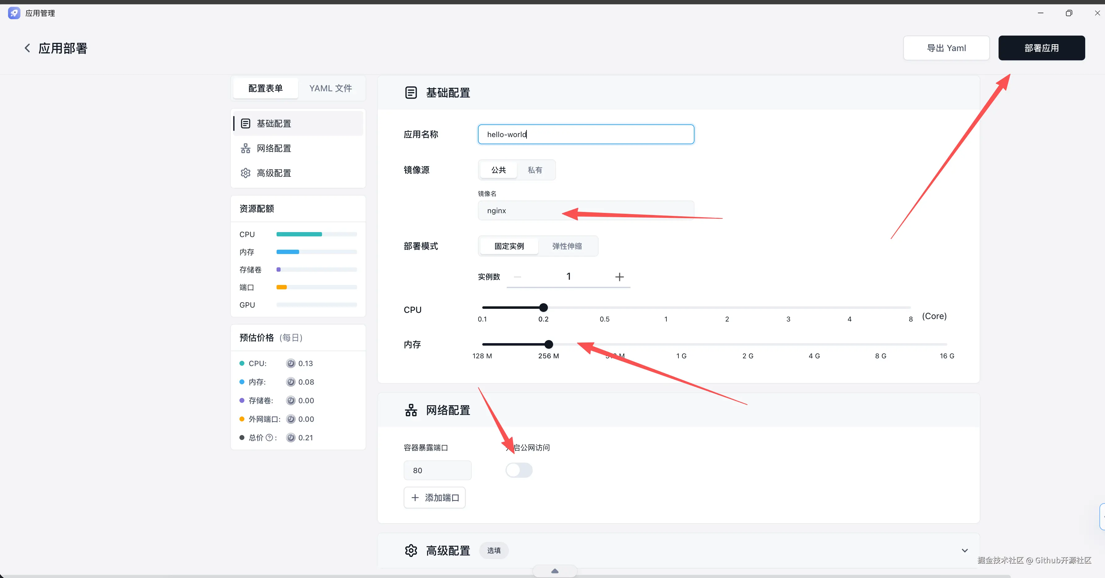 - 部署后端应用 和我熟悉的流程一样,我只需要提供后端服务的 Docker 镜像地址,在“应用启动器”中设置好端口和所需资源,点击部署即可。
