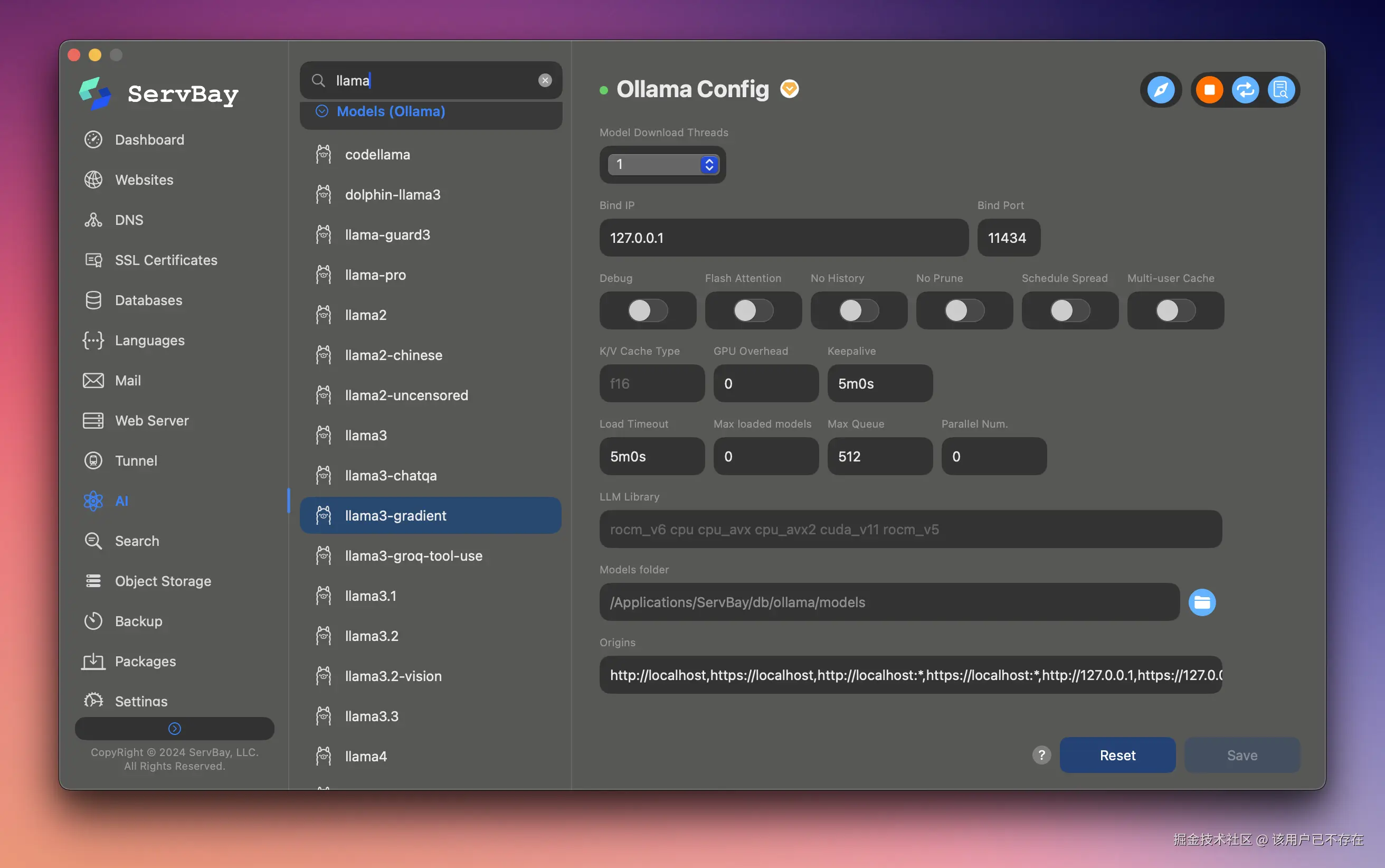 更值得一提的是,ServBay 支持一键在本地部署 Gemma、Llama 等开源大模型。对于希望在本地安全运行 AI 能力,或者需要快速搭建稳健开发环境的开发者而言,ServBay 提供了一种干净、可控的解决方案。