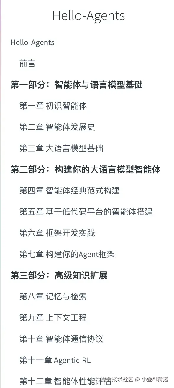 Hello-Agents 就是这样一个项目。它不满足于教你使用 Dify/Coze 等拖拉拽工具,而是立志带你深入底层,从 AI Native 的视角出发,亲手构建属于自己的 Agent 框架。