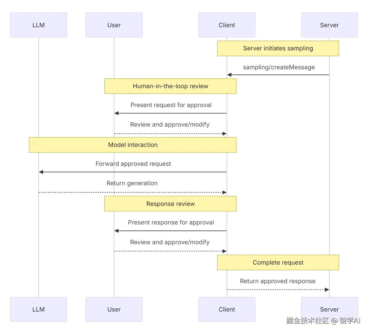 安全考虑: 在采样过程中,客户端和服务器都必须适当地处理敏感数据。客户端应实施速率限制并验证所有消息内容。human-in-the-loop 人机交互设计确保了服务器发起的AI交互在未经用户明确同意的情况下不会危及安全或访问敏感数据。